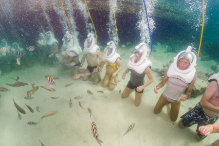 Seaquarium presenta una manera fácil y divertida de conocer el mundo que existe en el fondo del mar: ¡Es tan sencillo como caminar y respirar bajo el agua! Descubrirás un submarino abandonado y una gran variedad de peces coloridos. Ponte el casco conectado a la toma de aire, y estarás listo para descubrir y explorar el fondo marino, sin tener que mojarte el pelo y hasta con tus gafas puestas! Uno de nuestros buzos profesionales, estará presente en todo momento para garantizar tu seguridad. Esta increíble experiencia, fue diseñada para toda la familia, incluyendo niños de 120 cm de estatura en adelante. Disfrutarás del encuentro con leones marinos, snorkel con tiburones y mantarrayas, y finalizarás la visita con el baño en las piscinas naturales. Bebidas (ron, refresco y jugos) y snacks están incluidos y te acompañará la mejor música y animación del país.